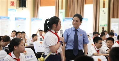 近日,郴州市检察院举办“检爱同行 共护花开”检察开放日活动,以增进社会公众对未成年人检察工作的了解和支持,推动形成未成年人保护合力。受邀参加活动的部分市人大代表、政协委员、人民监督员及教育、民政、妇联、关工委等部门走进检察机关,零距离体验、感受检察工作。图为郴州市检察院第四检察部主任刘艳与九完小学生进行互动问答。通讯员 周亚莉