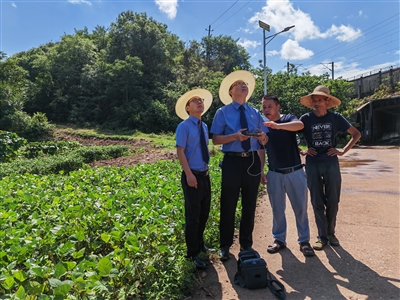 日前,衡南县三塘镇、谭子山镇、泉湖镇境内的部分稻田禾苗出现大面积死亡,图为6月27日,衡南县检察院公益诉讼干警在三塘镇宝庆村农田里勘察并用无人机取证。