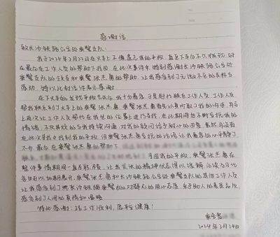 本报讯(通讯员 张晨 陈俊涛)“特别感谢乘警张杰勇,让我感受到了长沙铁路乘警对群众的用心态度,乐于助人的善良品质。感受到了人间的真情和温暖。”元宵节这天,乘警张杰勇收到了一封旅客手写的感谢信。