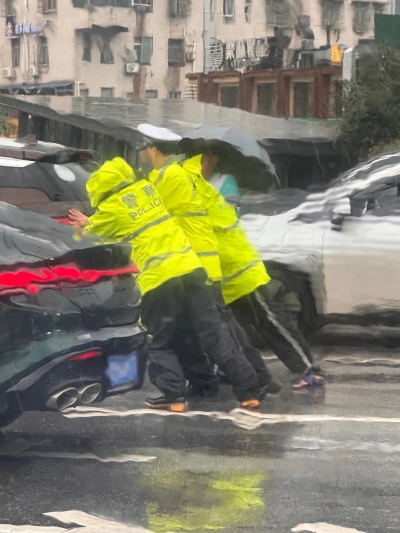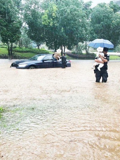 接警后,长沙市公安局特巡警支队岳麓特巡警大队联丰平台民警黄亮、曾毅和辅警方富祥赶到现场。“雨很大,路上水很深,那辆车熄火了,驾驶员不敢开车门,一开门积水就会倒灌进车里。”曾毅告诉记者,见此情景,民辅警蹚过积水路面,一面安慰车内人员不要急,一面让驾驶员打开车窗,引导被困人员从车窗逃生,民警则在车外接应。他们从车窗处将老人小孩一一抱出,转移至警车上,最后将驾驶员救出,被困车辆则由拖车公司前来救援。