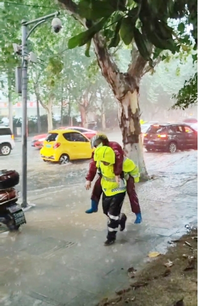 6月24日上午,长沙城区因突降暴雨,多处道路积水过深被阻断。一女子在砂子塘曙光路口,向暴雨中执勤的民警招手。民警立即赶过去,但女子已经坚持不住晕倒了。民警迅速把她从水中搀扶起来,将她背回岗亭休息。