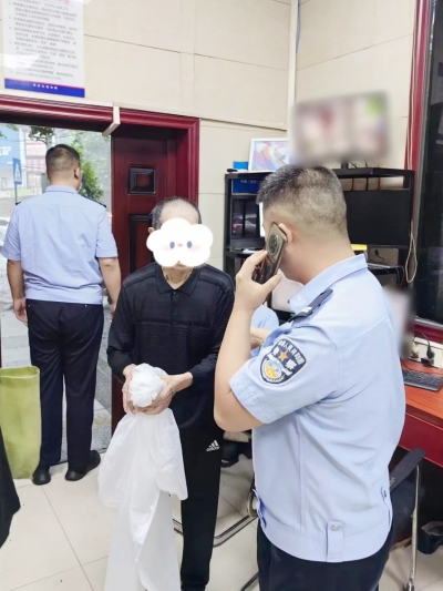 正当家人心急如焚之时,雨花区交警大队二中队巡逻交警在暴雨中找到了老人。此时的老人全身发抖、步履蹒跚。交警迅速将他迎进岗亭休息,见他全身湿透,为了不让他体温过快流失,选了一件干净的雨衣将他裹住,并迅速与其家人取得了联系,老人终于得以平安回家。