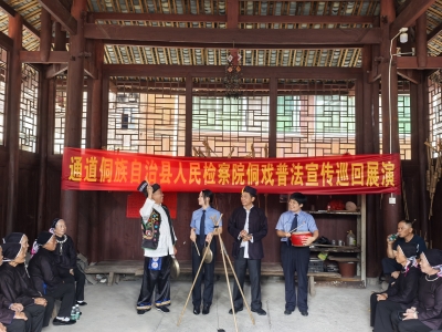 推行“双语+宣传”模式,提升侗族地区法治化进程。该院成立“双语志愿服务队”,充分利用大戊梁歌会、侗年节等侗族传统节日,依托侗族风雨桥、侗寨、鼓楼等侗族群众休闲聚集地点,积极组织双语志愿者深入偏远村组侗寨、田间地头进行法治宣传,通过拉家常、“讲款”等形式,现场为侗族群众答疑解惑。同时,邀请当地侗戏文艺队,与干警一起将枯燥抽象的法律知识演绎成当地群众喜闻乐见的侗戏、侗歌,在偏远乡镇巡回演出,将法言法语入脑入心,有效提升了侗族群众法律意识。