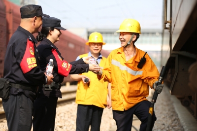 4月28日,怀化铁路公安处怀化站派出所民警在加强安全保卫的同时,给怀化车站列车上水工送矿泉水。为了南来北往旅客的方便用水,这些上水工人长年累月为列车供应水源,确保广大乘客旅途使用。