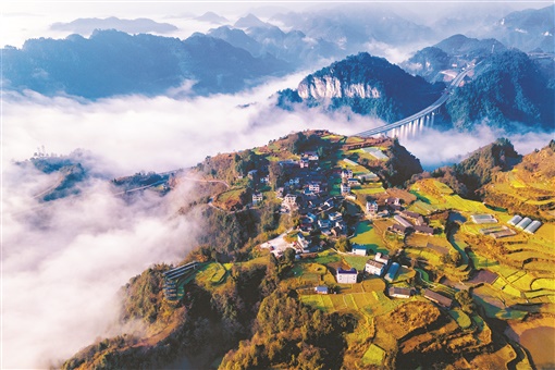 | ▲2月13日,吉首市石家冲街道庄稼村周边出现云海景观,与苗寨、山峦、高速公路相互辉映,美如画卷。 刘振军 摄 |