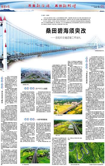 百业兴旺,交通先行。近年来,岳阳市委、市政府坚持以人民为中心的发展思想,聚焦创建全国性综合交通枢纽城市目标,加大交通基础设施建设力度,不断完善公、水、铁、空无缝衔接的综合立体交通运输体系,使岳阳的区位优势加速转化为交通优势、发展优势,为全面小康、乡村振兴提供了强力支撑。