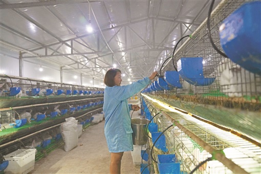 3000多平方米的兔场,兔笼多排分列,李群的投喂让一只只兔子兴奋异常。产仔房里,毛茸茸的小兔子挤成一团,甚是可爱。