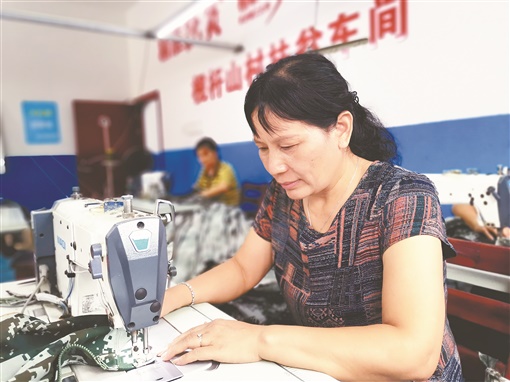 9月7日上午,记者见到龙艳洲时,她正在村部的湖南民富家纺公司,踩着缝纫机赶制军训服装。