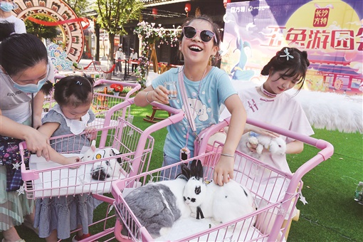 上图:9月19日,游客在长沙方特东方神画园区与“玉兔”亲密接触。中秋假期,该园举办“玉兔游园会”活动,游客一边欣赏精彩民俗表演,一边体验中秋传统文化。