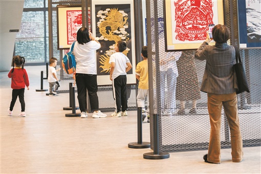 10月7日,吉首市乾州古城画桥美术馆,游人在观赏剪纸艺术作品。国庆期间,该市举行以“巧手展新貌,剪纸颂党恩”为主题的剪纸艺术展,让游人近距离感受非遗文化的魅力。刘振军 摄