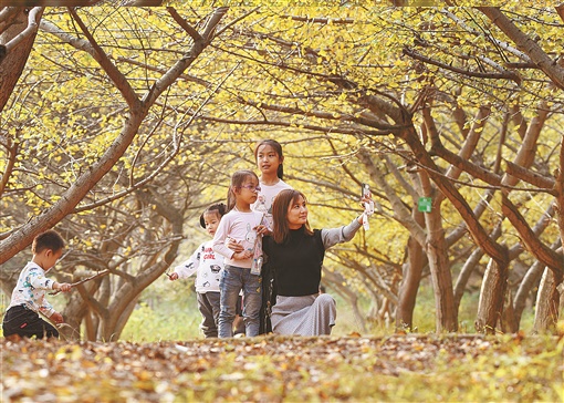 10月24日,嘉禾县国家森林公园,市民在开心游玩拍照。金秋时节,该县国家森林公园内,连片的银杏、梧桐、槐树、枫树等树叶渐渐变黄,成为森林公园一道亮丽的风景。