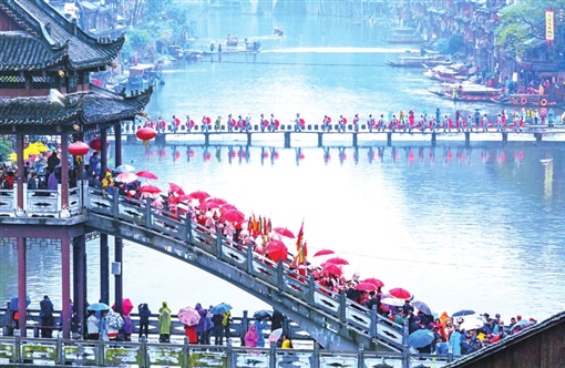 在完善文化旅游与乡村振兴利益联结上打开新局面。凤凰立足乡村资源特色和生态环境优势,以廖家桥新区为枢纽,打造环长潭岗“九营十八寨”休闲度假区、“三十六炯”苗山圣寨民俗风情游精品线路。在农旅融合、利益共享方面,凤凰抢抓高铁开通历史机遇,吸引更多直播、电商人才,邀请知名农业专家实地考察,加快农业科技推广,做大做强农业产业,促进村民致富增收。同时,依照企业+集体股权模式,鼓励村集体与旅游企业合作,合理开发特色村寨、山林、水库、道路等公共资源。目前,拉毫营盘、老洞、竹山、老家寨等40个传统村落已经签订旅游开发协议,村集体通过资源入股形式,实现年收益5—30万元。