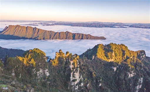 这是一条自然景观带。除世界自然遗产地武陵源,它还布局了天门山、八大公山、乌龙山、八面山、吕洞山、雪峰山、红石林,沅水和澧水在山间奔流,黄龙洞、九龙洞在地下暗涌,峡谷之上,人类巧手架设了张家界大峡谷玻璃桥、矮寨大桥。