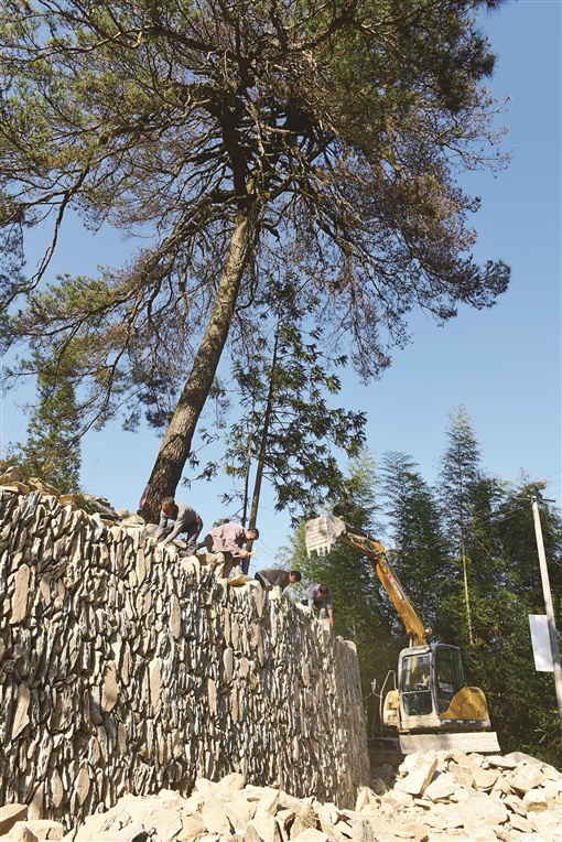 12月5日,溆浦县两丫坪镇黄金村,施工人员给村头一棵古松树修建护墙。这棵古松树有上百年树龄,当地林业部门已作为古树名木挂牌保护。为更好地保护这棵古松树,黄金村村委自筹资金4万元,给古树砌护墙、培土呵护。何国喜 摄