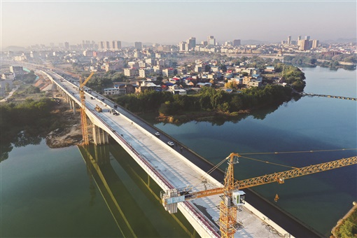 12月7日,207国道道县绕城公路潇水二桥拓宽大桥(左)桥面贯通,“双桥”飞架碧水间。接下来进入桥面及附属工程施工阶段。潇水二桥拓宽大桥通车后,将改善老桥车辆“肠梗阻”问题,改善交通状况。何红福 摄