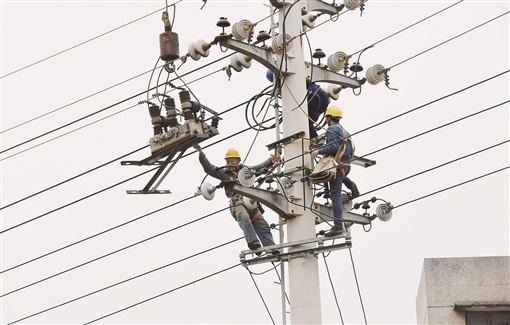 12月12日,江永县潇浦镇永回路,电力工人在高空进行施工作业。寒冷天气来临,用电负荷不断增长,该县电力部门多维度开展“迎峰度冬”各项举措,全力以赴确保电网安全稳定运行。田如瑞 摄