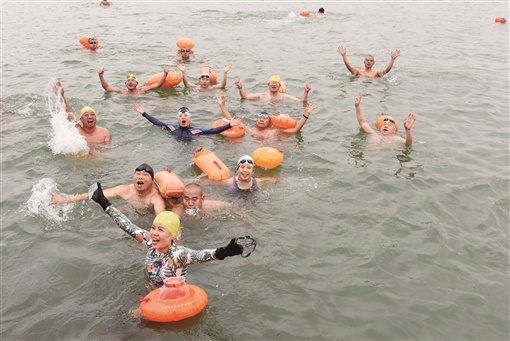 12月25日,澧水澧县兰江闸段,冬泳爱好者在游泳。当天,该县游泳协会30多名冬泳爱好者举行集中冬泳活动,挑战寒冷,磨练意志,强身健体。 柏依朴 摄