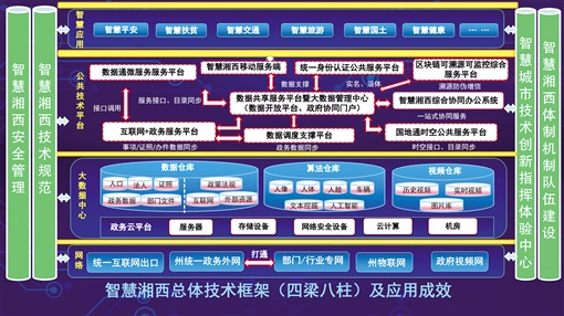 “州政府将大数据发展纳入全州重大决策、政府目标管理、财政预算、重大项目和中长期发展规划范围。从2017年以来,我们集约高效地搭建起了基于网络梁、数据梁、公共技术梁、智慧应用梁和机制体制、安全体系、标准体系、人才队伍、工程技术中心、应用智慧中心、创新孵化中心、微体验中心的智慧湘西‘四梁八柱’总体技术框架。”湘西州政府秘书长包太洋自豪地向我们介绍说。