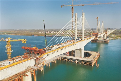 3月8日,常益长铁路沅江特大桥建设现场,中铁三局的工人在进行斜拉桥混凝土箱梁和斜拉索施工。该斜拉桥全长544米,是目前国内设计时速350km高速铁路中水深最深、跨度最大的无砟轨道连续钢构斜拉桥。预计4月下旬合龙,实现常益长铁路全线贯通。湖南日报全媒体记者 郭立亮 摄