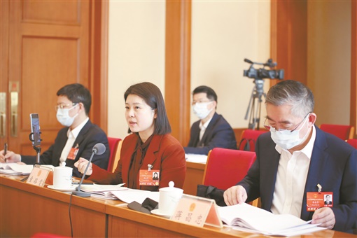 3月8日,童路雯代表(左二)在湖南代表团分组审议时,为助推革命老区走好新时代振兴发展新路建言。