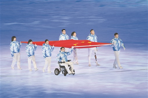 视障表演者动情演唱《我和我的祖国》,8名代表护旗入场;听障表演者用双手叙述国歌,无声却嘹亮;开怀的盲童将五彩画作铺洒在夜色里,千色万彩如溪流汇聚,残健共容的舞队在同心圆上演绎优雅的圆舞曲;来自英国曼德维尔的火种与北京、张家口、延庆的8处火种汇聚,集成“一起向未来”的热情期盼……