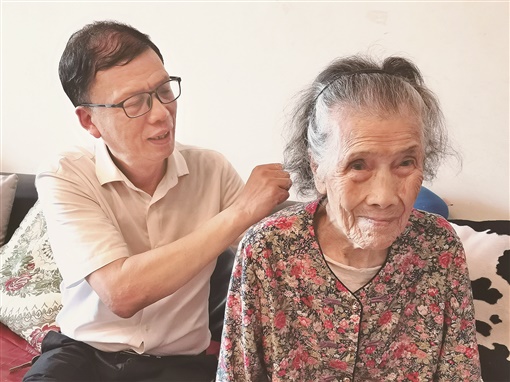 简单交流后,60岁的满崽坐下来给100岁的老娘揉肩、捶背。每天给母亲按摩,是伍建中的“必修课”,一按便是40多年。