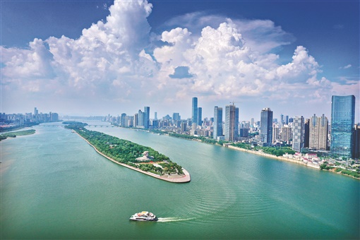 岳麓为屏,湘江为带,橘子洲浮碧江心。