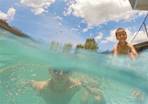 7月12日,江华瑶族自治县大路铺镇宝昌洞村留守儿童之家,孩子们在游泳池里开心地戏水。今年48岁的廖家喜于2016年放弃在广东的优厚待遇,返乡与人合伙创办了留守儿童之家,开设篮球、舞蹈、音乐、游泳等兴趣班。假期,留守儿童在这里既可以感受温暖关怀,又可以增长知识、开阔视野。