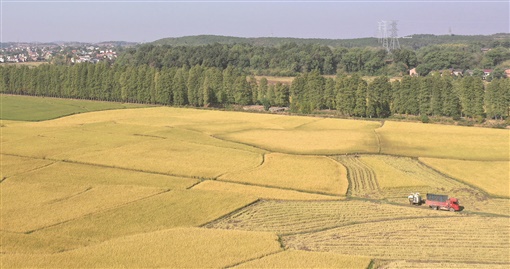 10月13日,祁东县白地市镇白地市村彭家湾片区,金黄的稻田、错落有致的村庄、笔直挺拔的水杉林,构成一幅美丽的秋色画卷。陈延上 摄