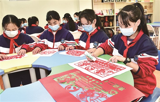 10月14日,学生在创作“喜迎二十大”剪纸凿花作品。当天,吉首市第四初级中学关工委开展以“‘童’心共迎二十大 非遗传承颂党恩”为主题的剪纸凿花活动,学生们运用非遗传统剪纸、凿花技艺创作,抒发苗家少年儿童爱党爱国情怀。
