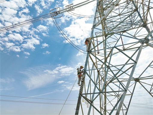 7月11日11时,500kV潇星Ⅰ线长沙县段,国网湖南超高压输电公司带电作业中心工作人员在处理铁塔端隐患,保证线路正常供电。湖南日报全媒体记者 童迪 通讯员 陈坚平 摄影报道