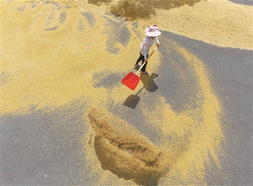7月11日,道县清塘镇楼田村,农民在晾晒稻谷。