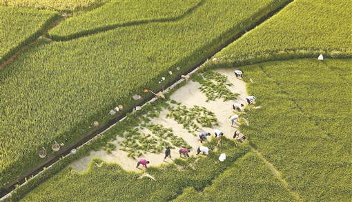 7月11日,双峰县井字镇花山村,农民在田间起秧。李建新 摄