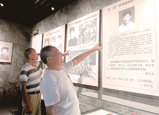 9月2日,郴州市苏仙区许家洞镇七一一时光小镇爱国主义教育基地,老矿工王本荣(左)、彭云太(右)在自己的展板前回忆奋斗历史。七一一矿是我国最早发现和勘探的大型铀矿山,近年来,当地把破旧的工业矿区打造成集红色教育、文创商业、温泉康养等为一体的工业历史文化街区,将整个矿区建成全国首家军工主题沉浸式体验旅游目的地。