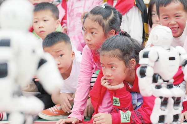 10月24日,学生在观看智能机器人跳舞。当天,“全国科普大篷车联合行动”走进通道侗族自治县第二完全小学,向学生展示科技成果,普及科学知识。