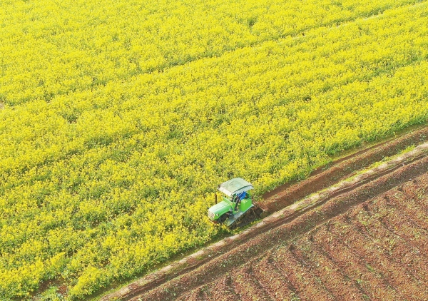 2月28日,嘉禾县晋屏镇下车村,村民驾驶农机在油菜花田里翻耕,为种植农作物做准备。时下,该县农民抢抓农时,积极开展翻耕、积肥、育苗、备种等农事活动,一派春耕备耕的繁忙景象。