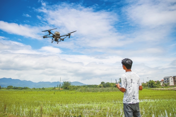5月30日,蓝山县塔峰镇荷叶塘村,农技人员操作植保无人机进行施肥作业。水稻管护关键期,该县各乡镇组织农技人员利用植保无人机对水稻开展施肥、喷药等精准高效管护,保障粮食稳产增收。