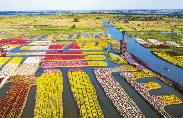 10月25日,游客在江苏省兴化市千垛景区赏菊游玩(无人机照片)。金秋时节,华夏大地层林尽染,诗意斑斓。新华社 发
