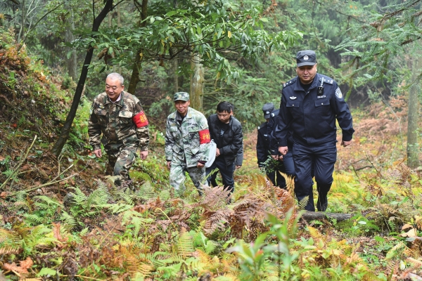 10月15日,溆浦县小横垅国有林场,县森林公安局民警和护林员一道巡山。伍希博 摄(湖南图片库)