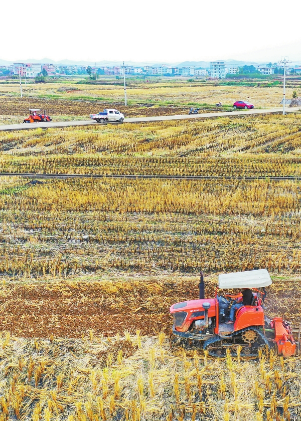 11月14日,嘉禾县坦坪镇托山村,村民驾驶农机翻耕农田。初冬时节,该县各地农民抢抓农时,开展翻耕、整地、农作物管护等农事作业,为冬播冬种做准备。黄春涛 摄(湖南图片库)