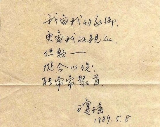 琼瑶夫妇回湘期间,湖南电视台举办了一台文艺晚会《问故乡你有几多情》,由李谷一演唱琼瑶作词、王立平作曲的《念我故乡》,直接将晚会推向高潮。连一向矜持的琼瑶都无法控制自己的情绪,离座冲上舞台,与正在演唱的李谷一拥抱在一起,全场观众为之动容。