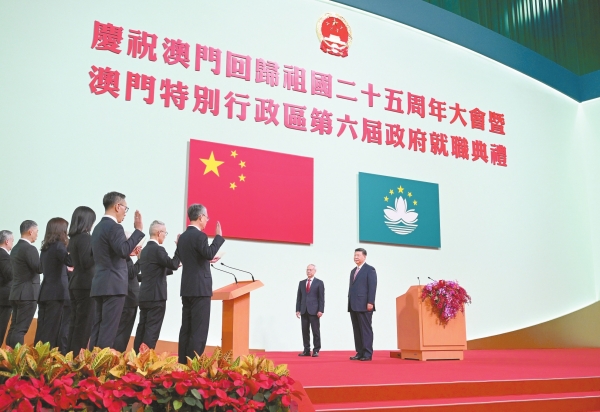 12月20日上午,庆祝澳门回归祖国25周年大会暨澳门特别行政区第六届政府就职典礼在澳门东亚运动会体育馆隆重举行。中共中央总书记、国家主席、中央军委主席习近平出席并发表重要讲话。这是习近平监誓,澳门特别行政区第六届政府主要官员在澳门特区第六任行政长官岑浩辉带领下宣誓就职。新华社 发