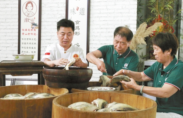 原来,早期的徽商从沿江一带收购渔获,再用一只只木桶盛装鳜鱼。一挑一桶,沿着青石板路,翻山越岭,最终卖到了徽州地区。为了保鲜,他们在桶内撒盐,将鳜鱼等鱼鲜层层码放起来,再不时地进行翻动。这样做,即便是过了七八天时间,鳜鱼仍能保持较好的质量,只是表皮散发出一种似臭非臭的气味。