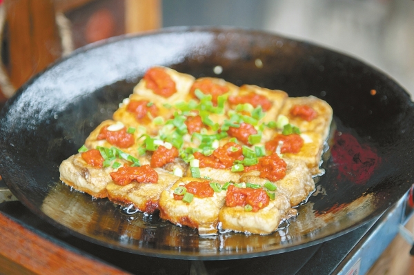 带着丝丝白毛的豆腐经过煎制后,金黄的外壳包裹着绵密软糯的豆腐芯,再蘸上一些当地特制的辣椒酱,让焦香的口感多了几分鲜辣,所谓融合之味、复合口感,体现得淋漓尽致。