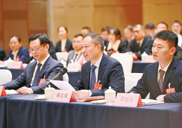 1月16日下午,益阳市代表团薛志成代表(前排左二)就加强装配式建筑与竹产业发展建言。湖南日报全媒体记者 唐俊 摄