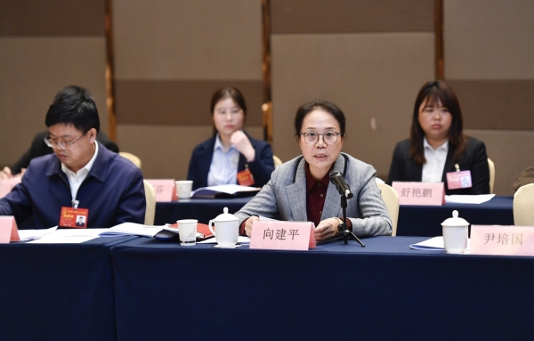 1月16日,怀化市代表团向建平代表(前排右)在审议“两院”工作报告时发言。湖南日报全媒体记者 辜鹏博 摄