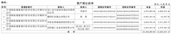 根据中国邮政储蓄银行股份有限公司湖南省分行(简称“邮储银行湖南省分行”)与中国中信金融资产管理股份有限公司湖南省分公司(简称“中信金融资产湖南省分公司”)签署的《中国邮政储蓄银行股份有限公司湖南省分行不良贷款批量转让协议》(编号:(2024)邮银湘FX012),邮储银行湖南省分行已将其对本公告附件“资产转让清单”中所列债务人及其担保人享有的借款合同及担保合同项下的全部权利及相关附属权益依法转让给中信金融资产湖南省分公司。现邮储银行湖南省分行与中信金融资产湖南省分公司联合公告通知各债务人及担保人以及其他相关各方。