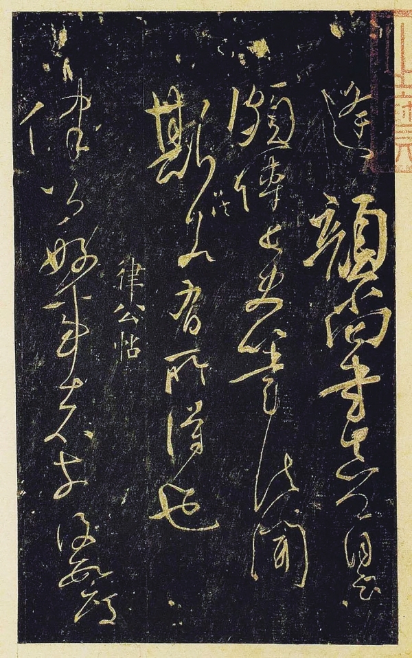 再看“游丝笔”典范的行草书《藏真帖》。公元772年末,怀素于洛阳求教于颜真卿,史称“洛下论书”。此次交流留下两件珍品:颜真卿作《怀素上人草书歌序》,怀素则写下行草书《藏真帖》。《藏真帖》6行、51字,用笔瘦劲而字形圆浑。“颜尚书”三字雄健高标,特立独出。作品后三行快意书写,显露出怀素“若有所得”的喜悦之感。后人将《藏真帖》与《律公帖》合刻于一石,立于西安碑林第三室。此帖笔法瘦劲,顿挫鲜明,线条飞动,极有力度,富有神采。点画粗处如坠石之势,细处如闪电遗光,迅疾骇人,不时有狂癫之态,然左绕右旋而不离法度。