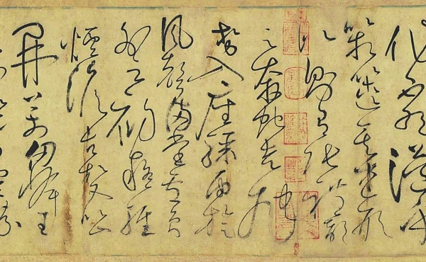 《四十二章经》,则是怀素禅意与狂草的浑然天成。唐大历十三年(778年),秋意渐浓时,怀素云游至南雁荡山。他尽情观赏了雁荡的奇峰、怪石、巨嶂、飞瀑,与高僧深入探讨佛经,品尝山中生态美食,心境惬意。仰慕怀素大名的精舍住持索书留念时,怀素欣然抄写了小乘经典《四十二章经》。《四十二章经》书卷中,狂草奇幻无形,恍如笔走风雷,满卷游龙委蛇。