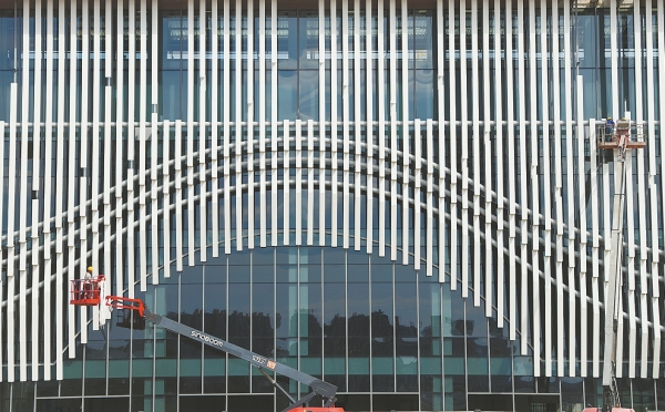 6月29日,怀化大剧院,工人在进行外墙装饰作业。时下,怀化市正全力推进文旅产业项目建设,各施工单位挂图作战、倒排工期,确保湖南省第五届旅游发展大会重点项目如期完工。